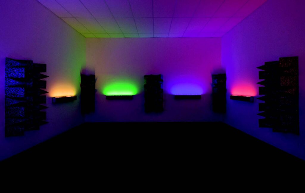Mirza used the word “acidgest” as the basis of his poem. This term is a play on “acid tests”—the name given to acid or LSD parties of the 1960s, and it conjures a world of hallucinogens and psychedelia. Mirza has replaced the first t with a g, a requirement of the programming system to avoid repetition, but also in reference to the ordering of nucleotides, the foundation of DNA, which are ascribed the letter codes of A, C, G, T. This seemingly nonsensical term—“acidgest”—has been transformed into a 16-million-line concrete poem created through computer programming. Matching each letter of the word to one of eight colors (red, green, blue, yellow, magenta, cyan, black, and white), the poem consists of every possible combination and order of these letters in eight-character lines. As the letters shift position along the grid of this text, the colors of each letter determine the light and sound emissions of each speaker, constituting a translation and materialization of Mirza’s poem. Each letter corresponds to one one-thousandth of a second, and it takes 18 days for the entire score to be played. The piece is set to play from the beginning on the first day of each month throughout the exhibition’s run.
