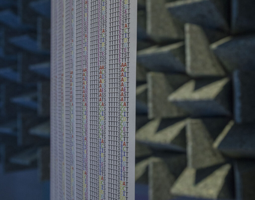 The artist has compared the patterning of the letters to the reordering combination of nucleotides in the double helix of DNA and is interested in the interrelationship between DNA and psychedelia, and more broadly in the unseen patterns present in much of our lives, whether biological or mechanical, observed or imagined. Printed on a massive scroll and hung from the upper register of the gallery—not unlike the piano rolls of the late 19th century that bear a formal echo—the system of the poem dictates the entirety of the piece through patterned and repeated information.
