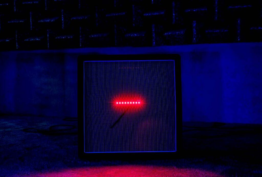 This gallery is one of a number of exaggerated or disproportionate architectural spaces Mirza has engaged recently. Here he responds to the space as an acoustic site, employing its expansive height to create distinct auditory phenomena. On the floor of the gallery Mirza has gathered a ring of Marshall cabinet speakers in a circular arrangement he uses frequently. Each speaker has been modified, its systems physically rewired and its surface affixed with strips of colored LED lights that cover the Marshall logo. The amplified sound of the electrical currents simultaneously powering the LEDs as they turn on and off emanate from each speaker. Each color corresponds to a different electrical frequency and thus a different tone and temporality; together they create an organic, nonmusical rhythm of buzzing, droning, and humming sounds, making audible what writer Emma Warren has referred to as the “hidden harmonics of random sound.”