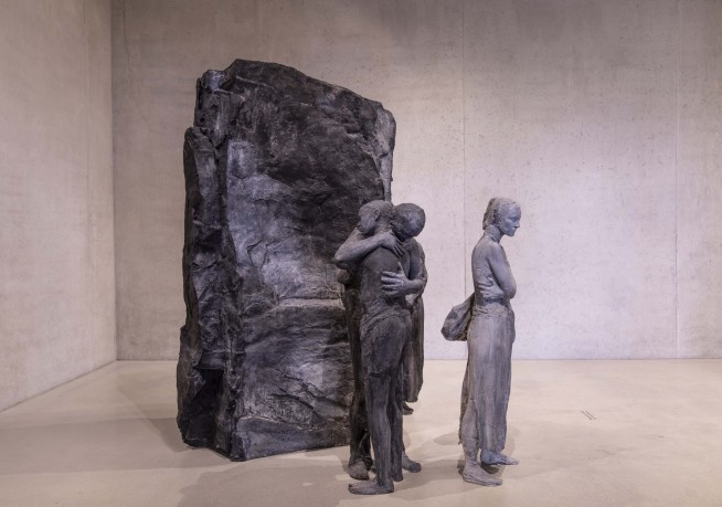 The sculpture examines a dilemma faced by the Old Testament patriarch Abraham. In this story, Abraham’s wife, Sarah, seeks to secure her son Isaac’s right of inheritance by demanding that her husband expel his mistress Hagar and their first-born son Ishmael from their home. Abraham, upon receiving divine promise of Hagar and Ishmael’s safety, reluctantly banishes them to the desert and possible death. The father’s tenderness, Sarah’s rage, and Hagar’s resigned acceptance portray a diverse range of human emotions. The story can be said to contain the Biblical roots of today’s Arab-Israeli conflict, since the Jews reputedly descend from Isaac and Muslims from the exiled Ishmael. The life-size pieces invite the viewer in as a participant in the drama of an enforced farewell. Moving around the figures, one can experience the psychological dynamics of this traumatic story. Unlike many of Segal’s previous plaster sculptures, this work is painted a dark and somber gray. These colors contribute to the overall feeling of sadness conveyed in the piece.