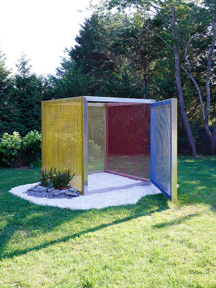 As one enters the installation Penetrável Macaléia, the red, blue, yellow, and white mesh screens play subtle tricks on one’s perception, casting the world outside and within it in flickering colors. Dematerializing the object’s sides, the effect combines with the work’s lively backstory to subvert the weighty seriousness and austerity of Minimalist art and its iconic form, the cube. With the addition of gravel and live plants, the work playfully brings the “real world,” specifically the Global South, into the antiseptic space of art. Penetrável Macaléia functions brilliantly both inside and outside, always interacting with its surroundings and its participants, merging art and life.