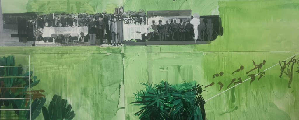 In 2022, Anderson participated in the Kingston Biennial. While working on that project, he traveled to and from Jamaica through Miami; coming face-to-face with the two murals Abrahams painted on Jamaican history for the airport in 1985. During this time, Abrahams’s murals began resonating with Anderson in a different way. Reflecting on the importance of Jamaican history, and the rich history of the Caribbean as a whole, Anderson began working on ideas for this show while taking these trips. Thinking of what these historical murals mean for immigration, but also as a point of entry and departure for tourism, Anderson developed this new sixteen-panel painting.
