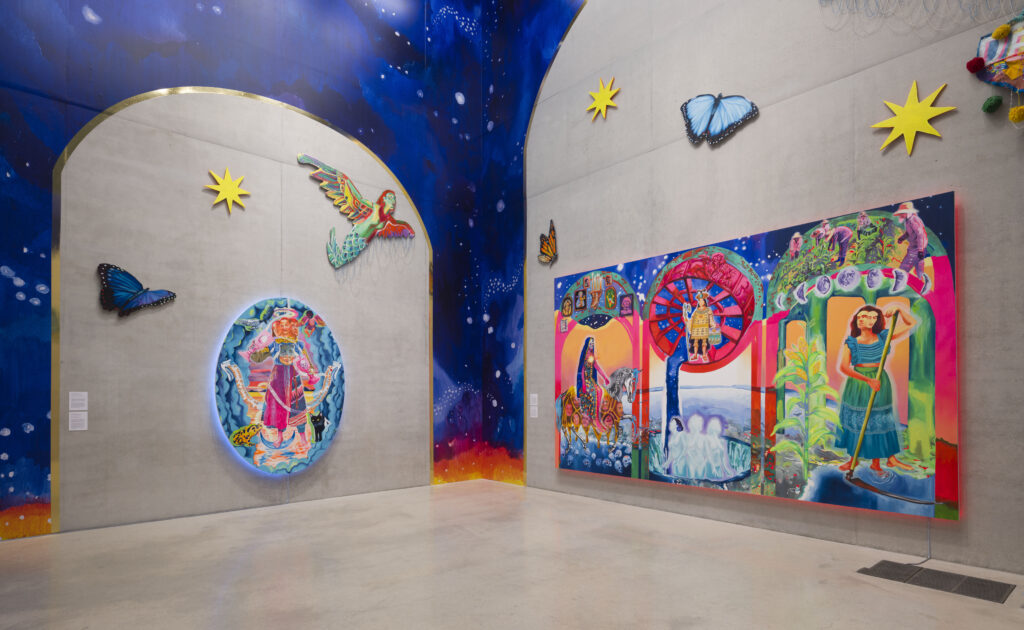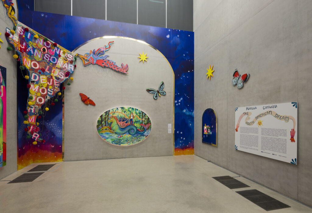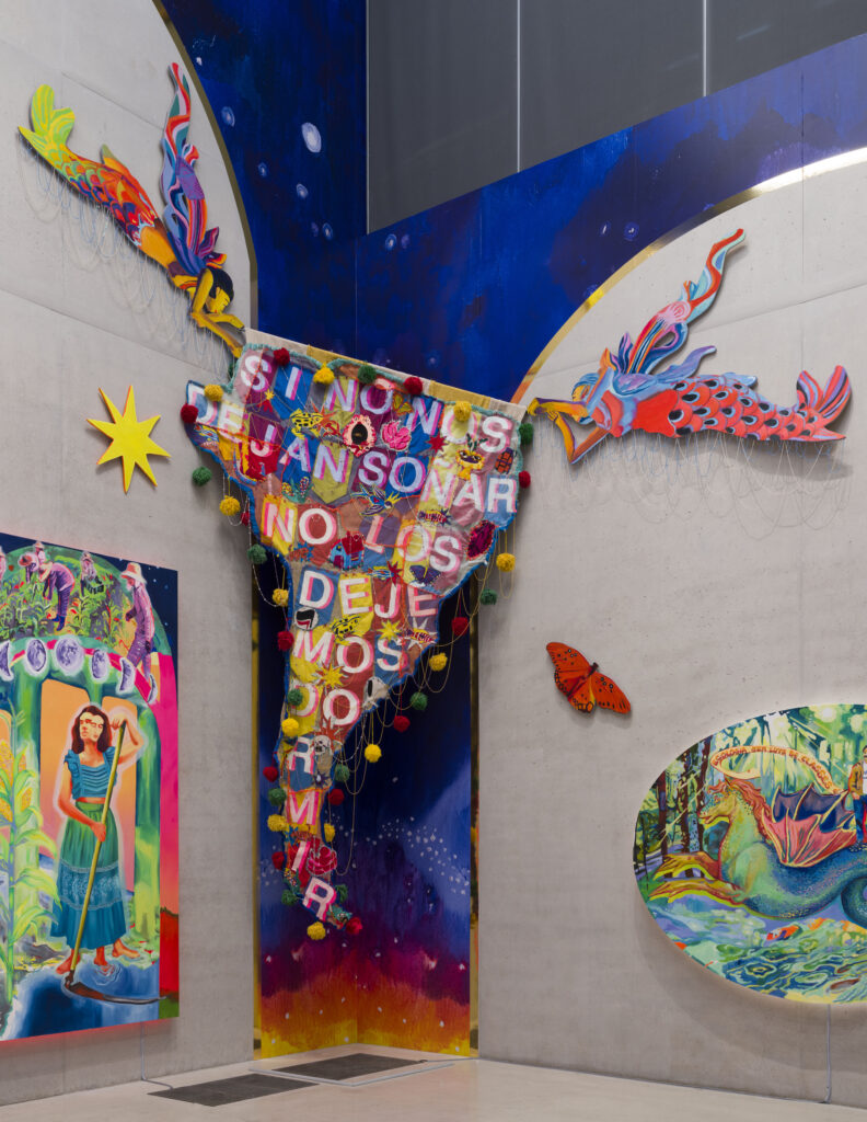 The South American Dream is the artist’s first solo exhibition in the United States and presents all newly commissioned works. In this painting installation, Cantuária invites the viewer to consider the nature of these dreams. Explored within the three main paintings, she highlights the narratives of critical activists and environmentalists in South America who pursued their dreams through resistance and by fighting for their countries and land, including figures such as Chico Mendes, Dorothy Stang, Maria do Espírito Santo da Silva, Túpac Amaru, and Juana Azurduy de Padilla, among others. While her research highlights where struggles and injustices lie, her paintings point to the beauty of the fight that often persists in these stories; thus, the paintings become monuments for iconic South American figures who, despite dangers and devastating odds, fought for their visions. In The South American Dream, Cantuária elevates and revives these histories, ideals, and battles, sharing with viewers the richness of South American natural resources that so many struggle to protect.