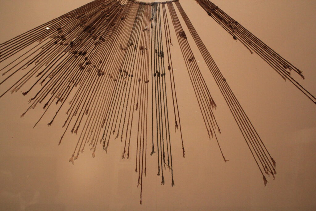 Vicuña’s piece takes its name from the Quechua language, “quipu” meaning “knot.” A quipu is a special way of keeping records used by ancient people in the Andes, like the Inca. Each quipu was made of colorful strings that were knotted according to the number of objects being counted. This could be anything, like how many animals they had or how much food they grew.