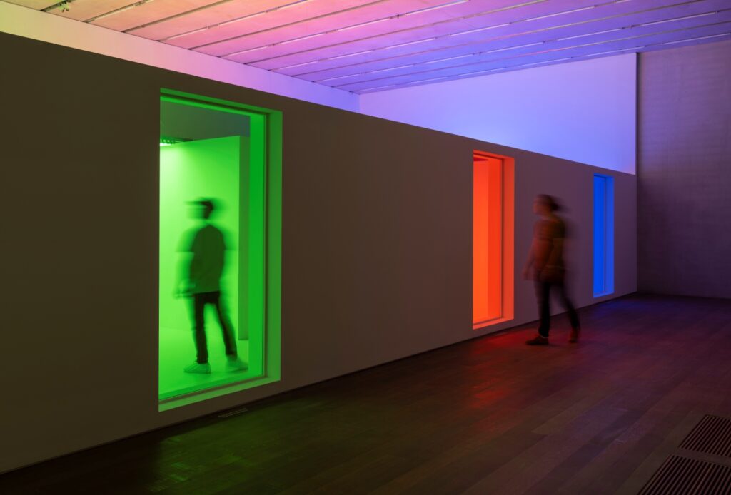 Each room is fully saturated in bright colorful light. The first room is green, the second red, and the final room is blue. Each room has two six-foot openings positioned at opposite corners as visitors progress from the green room through the red and into the blue. In the areas where two hues meet, secondary colors and gradients are visible as the two primary hues reflect their mixtures of light and intensity. White cubes are suspended above visitors’ heads at the threshold of the different chambers, bathing them in this reflected color. The suspended cubes heighten this experience; their surfaces bathed in reflected color that showcases the vibrancy of an environment entirely free of form and meaning.