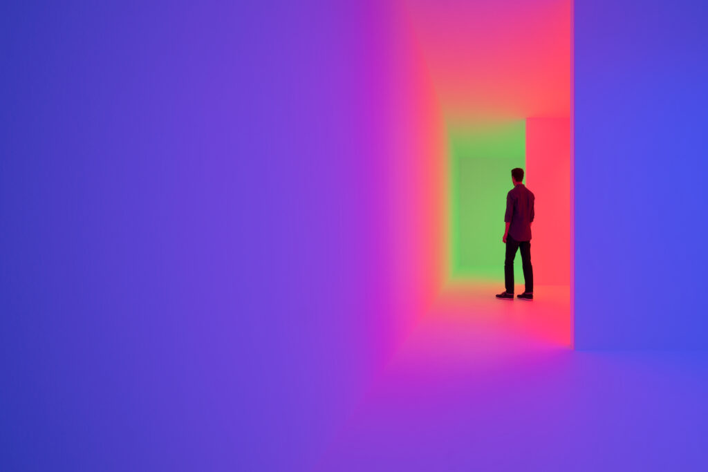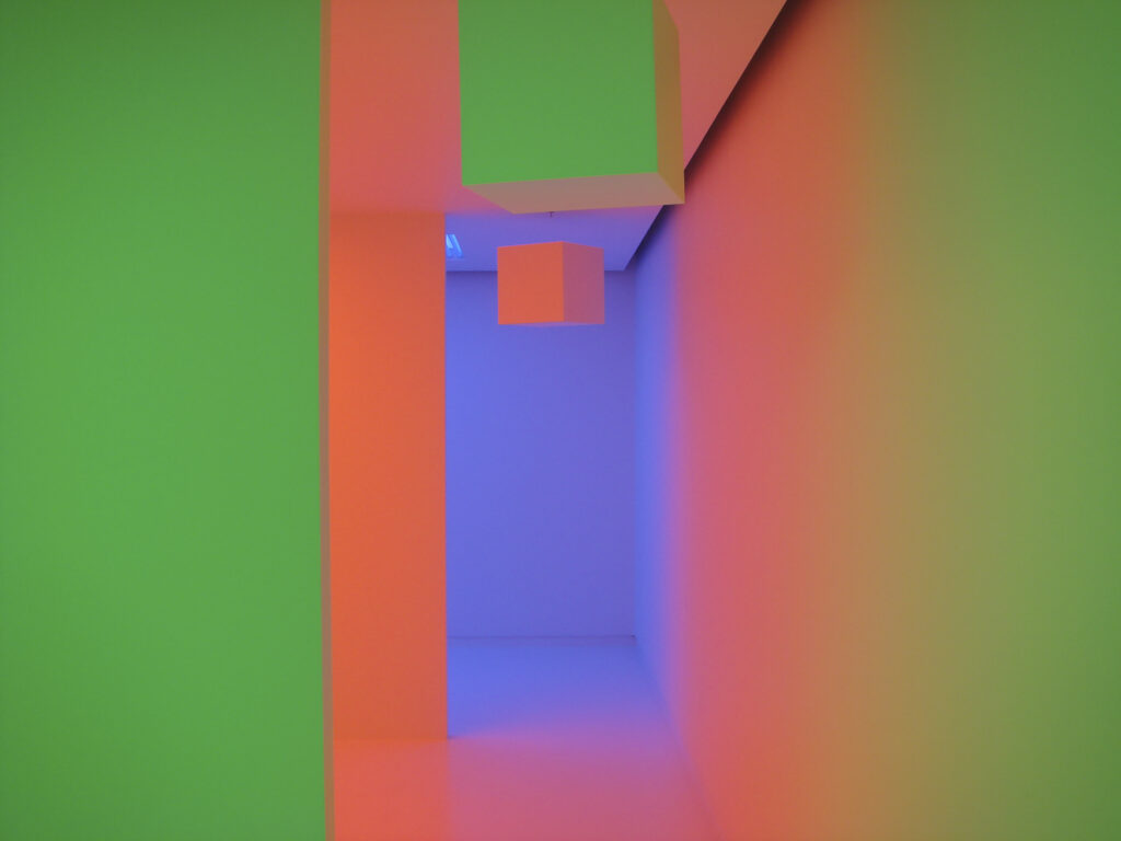 Each room is fully saturated in bright colorful light. The first room is green, the second red, and the final room is blue. Each room has two six-foot openings positioned at opposite corners as visitors progress from the green room through the red and into the blue. In the areas where two hues meet, secondary colors and gradients are visible as the two primary hues reflect their mixtures of light and intensity. White cubes are suspended above visitors’ heads at the threshold of the different chambers, bathing them in this reflected color. The suspended cubes heighten this experience; their surfaces bathed in reflected color that showcases the vibrancy of an environment entirely free of form and meaning.