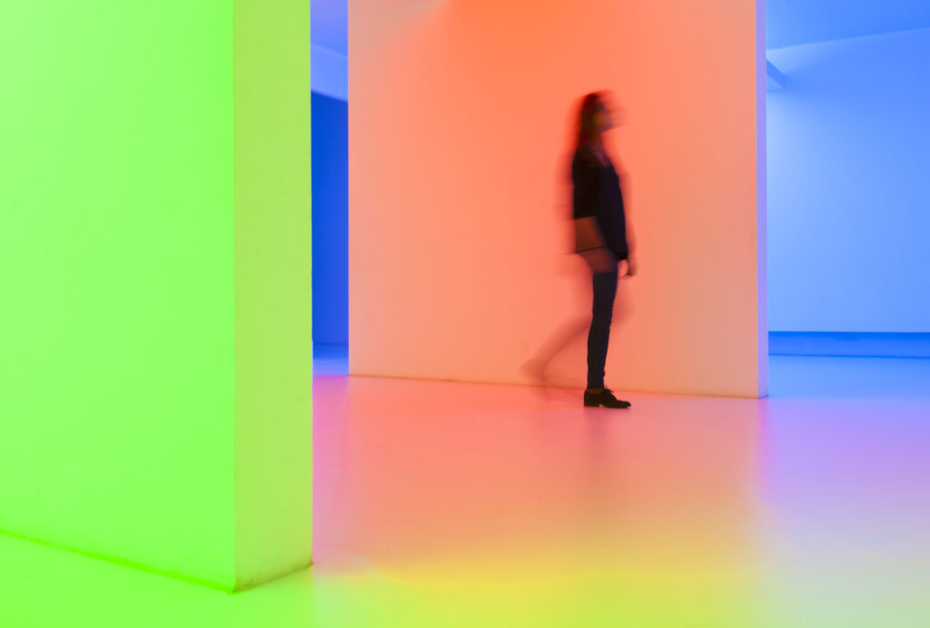 While Deconditioning Labyrinth was never fully realized, different configurations of Chromosaturation have been exhibited all over the world since. This version at PAMM features rooms entirely bathed in light-based colors, known as additive colors—red, blue, and green. Unlike the traditional primary colors we learn in school, these additive primaries create white when combined. This additive system is often used for lights and screens, mimicking how the receptors in our eyes perceive color.