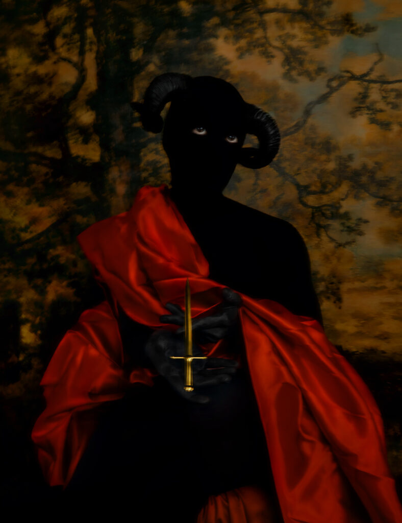 At the center of this image is a silhouetted figure against a sepia forest background with branching trees. The figure appears ram-like with curved horns on its head, rendered in deep black with only the eyes visible as bright white points looking upward. The figure is draped in flowing red fabric that creates dramatic folds and shadows across the torso.