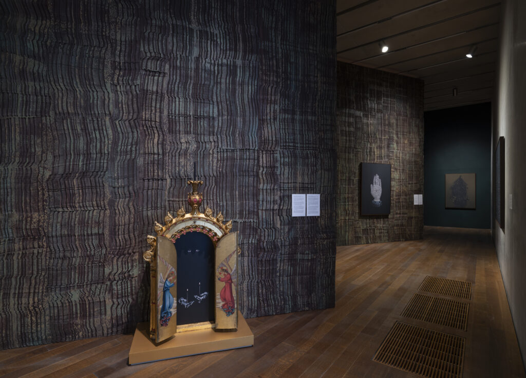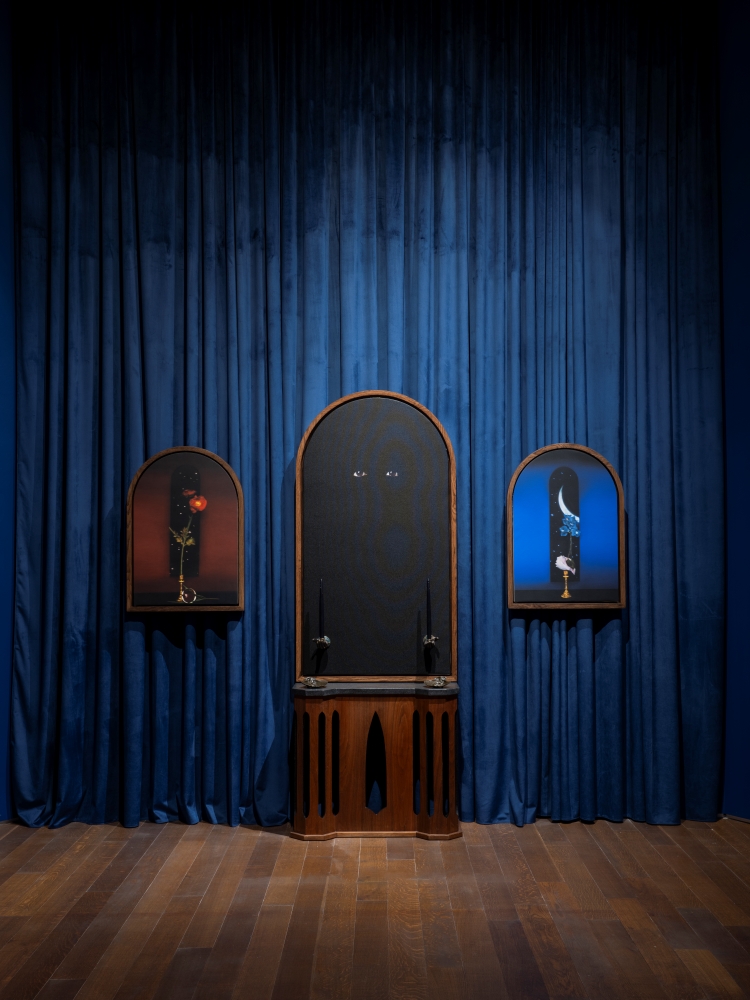 The right panel shows a deep blue background with eyes visible in the dark upper section. In the background, there is a white crescent moon shape with blue flowers, positioned above a golden candleholder. The overall installation creates a powerful sense of sacred space, with the dramatic scale and careful lighting emphasizing its function as both artwork and spiritual contemplation.