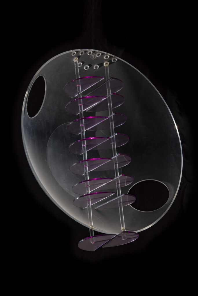 At the center, vibrant purple half discs descend in a tiered formation that suggests a spiral or DNA helix, appearing to float within the transparent architecture. Each half disc is suspended by two slender cylindrical acrylic supports that maintain their exact spatial relationship. Two of these purple half-discs hang beneath the main hemisphere, positioned as if they’ve penetrated an invisible boundary—suggesting motion and the breaking of dimensional constraints.