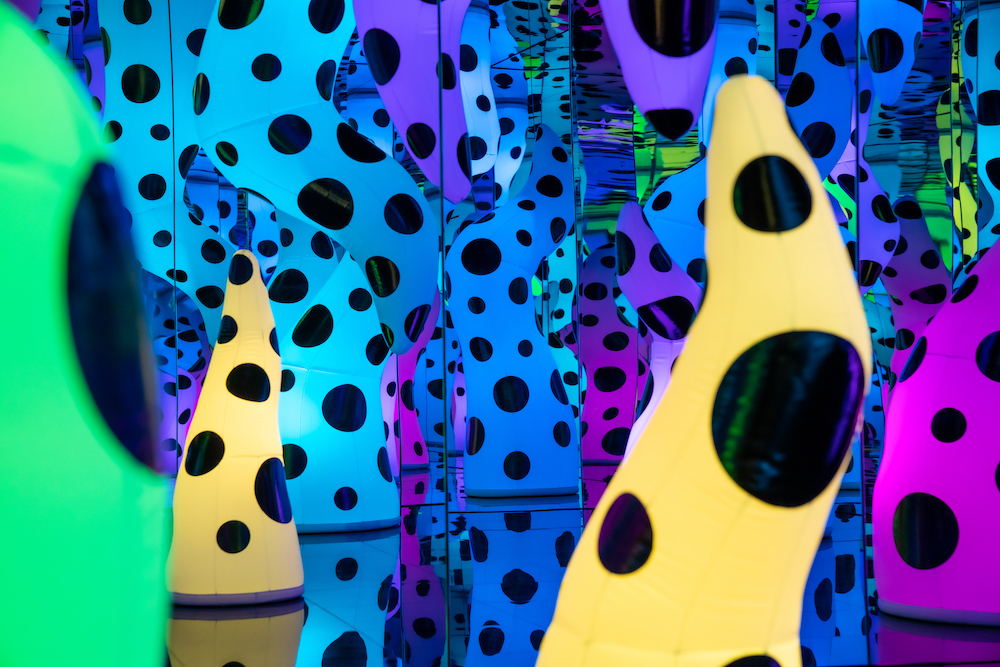 In 1965, Yayoi Kusama produced her first of what would become twenty infinity rooms. That piece, entitled Infinity Mirror Room (Phalli’s Field), was made of a room of mirrors with small and white phallic shapes covered in red polka dots. The infinity rooms that followed have all been different, however this room, LOVE IS CALLING, seems to share with its older sibling the subject matter of objects that appear like abstracted and dismembered phalluses.