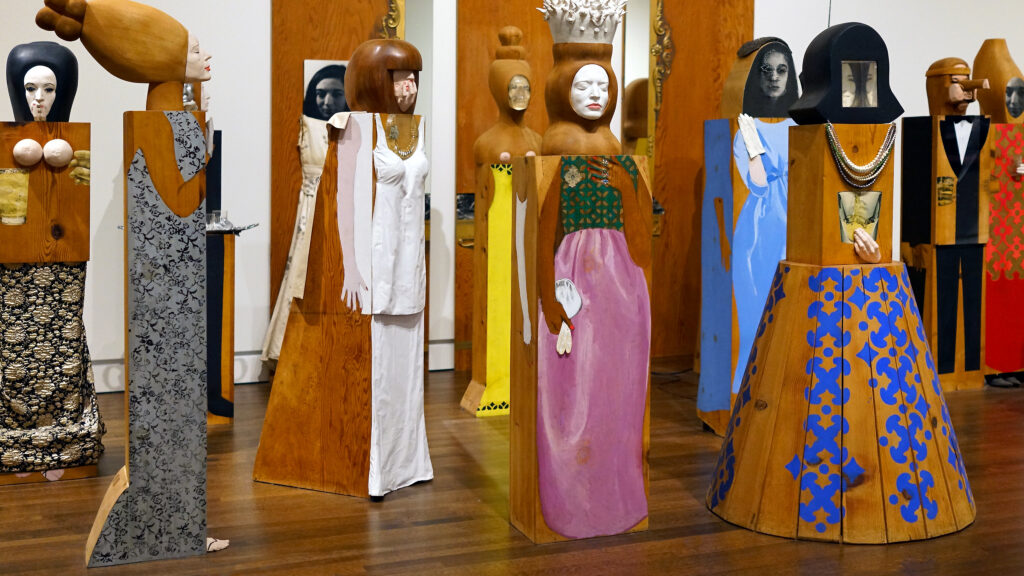 The sculpture is made of fourteen individual figures made of wood standing in front of a backdrop of an ornate fireplace. The fireplace is made of three panels of rectangular shaped wood that are separated. The two outer panels have a small vertical section of mirror that is outlined by an ornate and gold colored trim. In front of the fireplace fourteen figures are gathered and most of them appear to be women dressed in elegant clothing. Two of the figures appear to be servers as they are holding trays with glass cups on them. While all the figures are decorated differently, they all share a common trait in their construction. Their torsos are made of one to two solid and flat pieces of wooden blocks while their heads are separate and often carved into more complex shapes that resemble hair, headdresses, or hats. The clothing of the figures varies from being actual articles of clothing to being painted and range in color from pinks, yellows, blues, reds, whites, and often untreated and exposed wood. The faces of the figures also vary from pasted images to sculpted plaster and plastic.