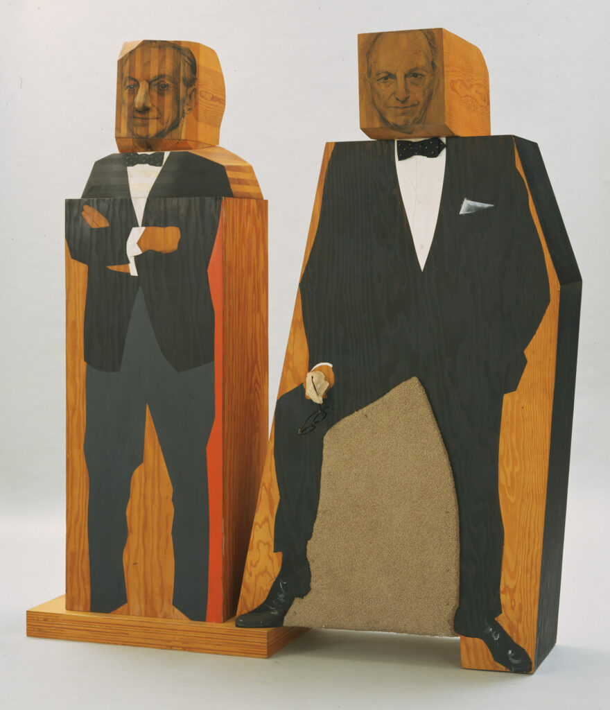 The figure to the right is constructed in a similar way. The head is carved and, on the front facing side which is flat, the face of Sidney Janis is drawn in graphite. The head rests on a large and irregularly shaped block of wood. This large block of wood serves as the entire body of the figure. The body is painted on the flat surface. He wears a black suit with white shirt, white pocket square and black trousers. The bowtie he is wearing is black with small white dots. It is a real bowtie fixed onto the wood. The hand on the left is resting on his knee and is made of plaster. The plaster hand is holding black eyeglass frames. The other hand is hidden inside the pocket of his trousers. The leg on which the figure rests his hand is bent and the foot is resting on the platform of the figure on the left. The shiny black shoe he is wearing protrudes from the flat surface and appears to be a real shoe. The other foot rests on the floor. In between the legs there is a piece of brown carpet cut into the shape the space creates.