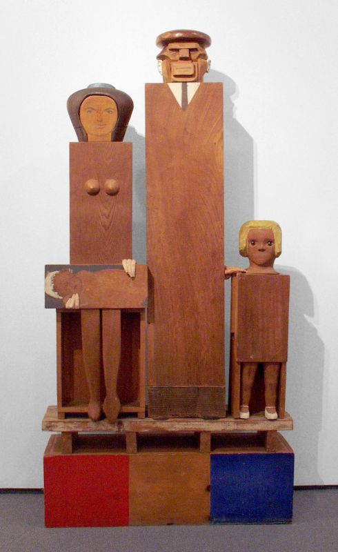 The Kennedy Family by Marisol is a sculpture from 1961. It is made of mixed materials. It measures roughly six and a half feet tall by four and a half feet wide and twelve inches in depth.