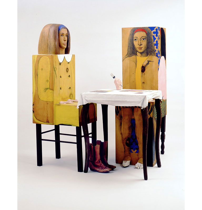 The sculpture features two figures depicting Marisol having dinner with herself.