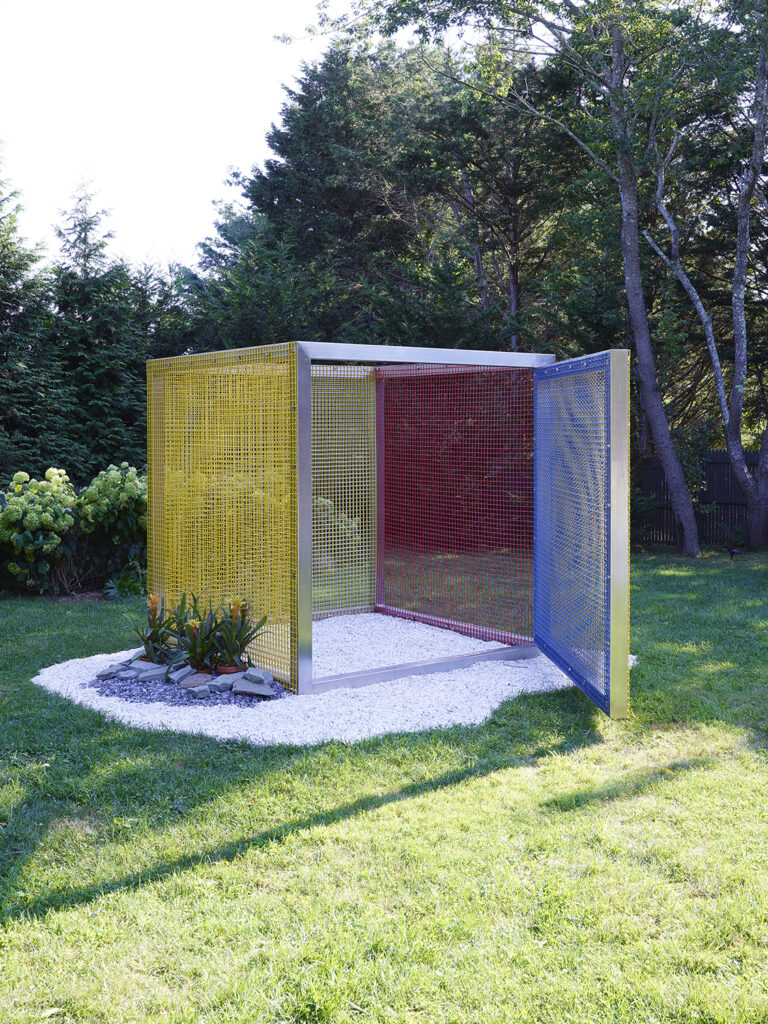 Penetrável Macaléia (Malaceia Penetrable) by Helio Oiticica is a sculpture conceived in 1978 and made in 2010. It is made of stainless steel, colored metal screens, sand, gravel, bricks, and plants. It is a cube that measures roughly seven feet on all sides.