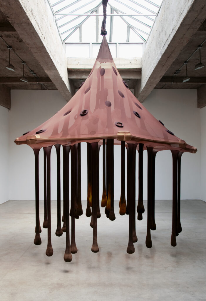 Ultra Spheroid (Gold Aqua) is a sculpture made by Gisela Colon in 2017. It is hung on the gallery wall and measures roughly seven and a half feet tall by three and a half feet wide and a depth of one foot. It is made of blow-molded acrylic.
