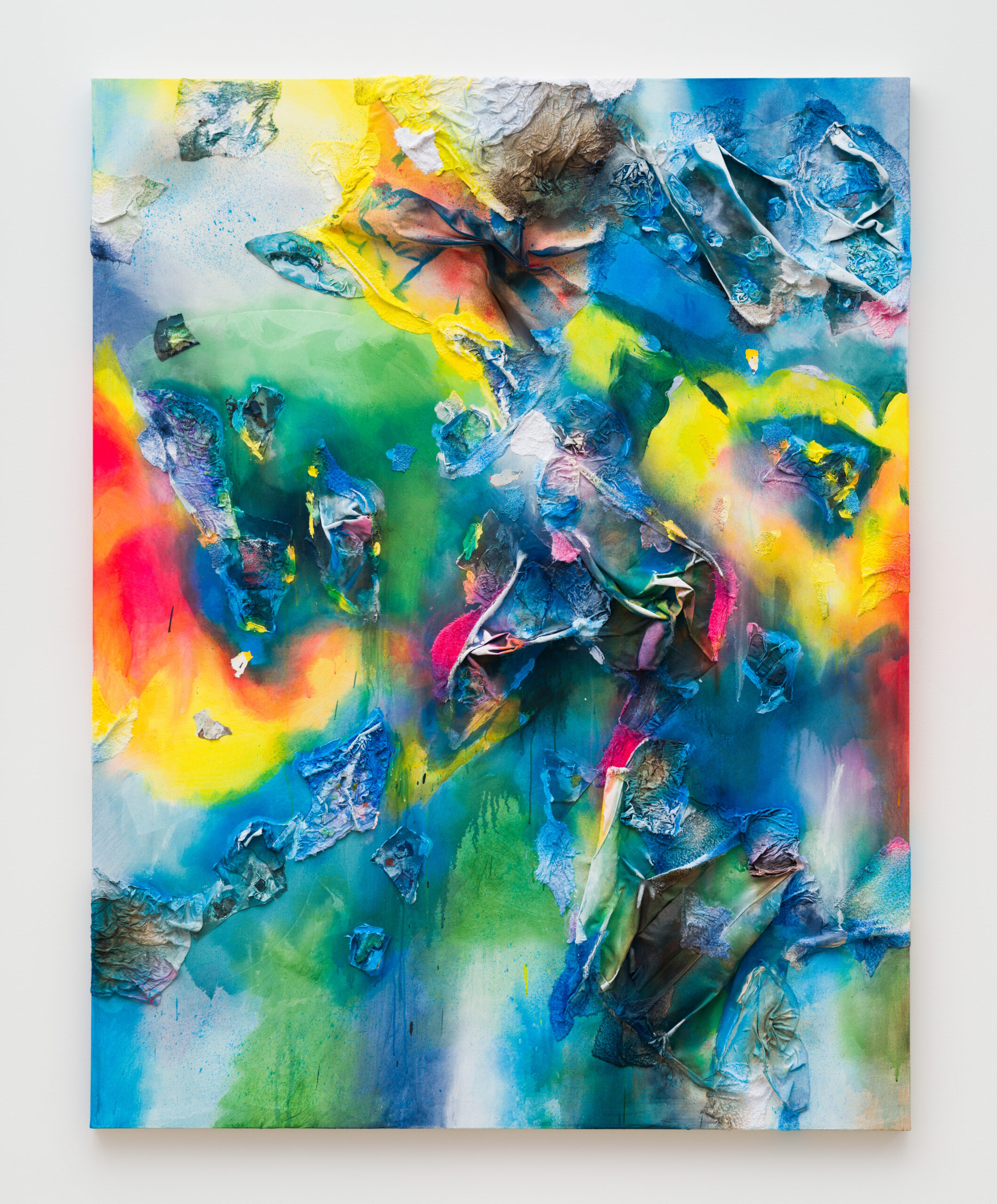 Raidne by American artist Mark Bradford is a mixed media piece from 2017. It measures ten feet tall and ten feet across.