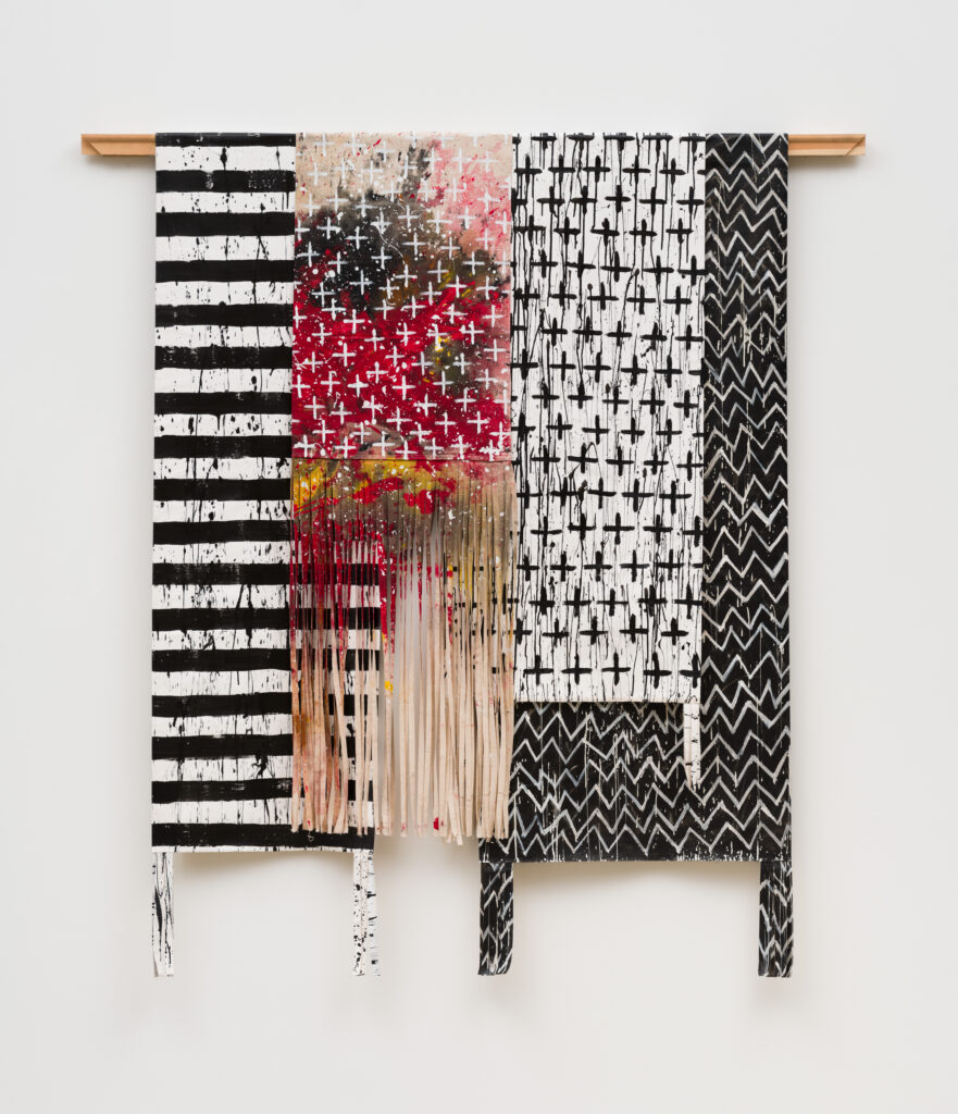 The painting resembles a woven tapestry, with multiple layers of canvas oveRo intricate and culturally rich artworks that delve into his Navajo heritage and identity. Drawing inspiration from his Navajo descent, Hubbell’s art weaves a tapestry of symbolism, patterns, and imagery rooted in Navajo culture, spirituality, and tradition. His artistic practice encompasses a diverse range of mediums, including painting, drawing, printmaking, and mixed media.