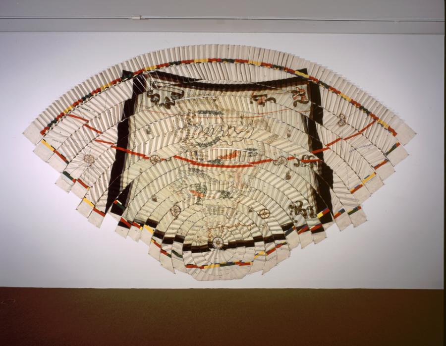 Chodorów II by artist Frank Stella is a felt, paper, and canvas collage on canvas made in 1971. It is hung on the wall, measures roughly nine feet by nine feet, and is around two inches thick.