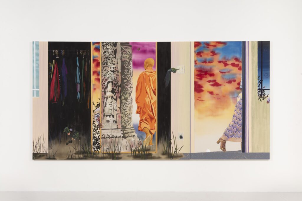 The dissension of Anansi (#19), is a painting by Jamaican born artist Leasho Johnson made in 2022. It is made with charcoal, watercolor, acrylic, oil stick, oil, coffee, logwood dye, gold foil, and gesso on paper mounted on canvas. It measures seven feet tall by just over four feet wide and two inches deep. It is in vertical orientation, meaning that its shortest side runs parallel to the ground.