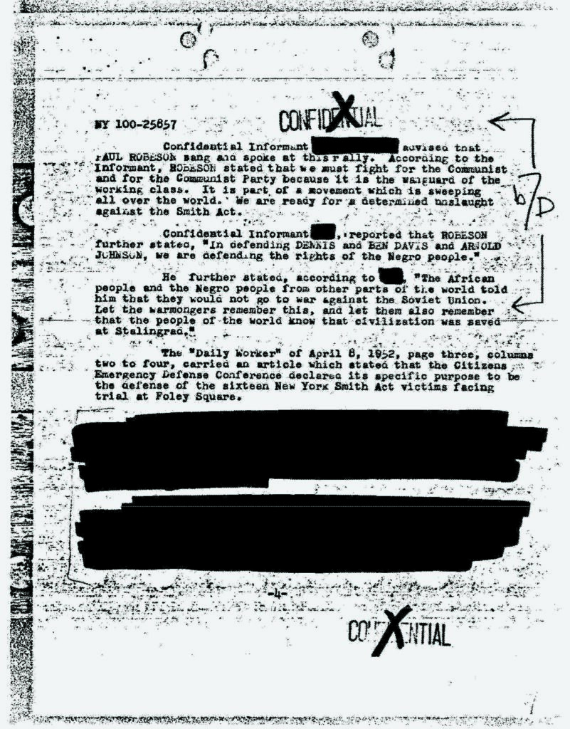 Paul Robeson es la figura central de End Credits (2012–en curso) del cineasta y videoartista Steve McQueen. Esta instalación inmersiva de video de duración extendida manipula el texto y el sonido para mostrar al espectador la envergadura del ahora desclasificado dossier que el gobierno estadounidense compiló sobre el famoso cantante. McQueen obtuvo acceso a los archivos a través de la Ley de Libertad de Información, que otorga a todo individuo el derecho de solicitar información y expedientes de las agencias del gobierno federal. El artista escaneó cada página del archivo del FBI, el cual incluye recortes de periódico, entrevistas y registros de vigilancia, y convirtió los documentos en una secuencia de video. Luego grabó a actores y actrices que leían los textos de ciertas páginas del expediente de Robeson. Las voces tienen un tono frío, narrativo. En la pantalla apenas se puede leer el contenido de los documentos, ya que las páginas se van desplazando rápidamente. Varias contienen secciones tachadas que censuran partes de oraciones y párrafos, incluidos los nombres de los agentes del FBI y otros informantes civiles que ayudaron a recopilar la información. Las voces de los hombres y mujeres leen las frases que describen a Robeson, tales como “el cantante negro Robeson”, “el célebre cantante negro” y “el distinguido cantante negro”. Los expedientes revelan las actividades profesionales y militantes de Robeson, desde recaudar fondos para luchar por el mejoramiento de los hispanos y judíos que vivían en Estados Unidos hasta sus presentaciones en concierto. También evidencian su apoyo a eventos y organizaciones de izquierda, tales como la Conferencia sobre el Derecho de Puerto Rico a la Libertad, el Comité para Terminar la Segregación en el Béisbol y el Comité Conjunto Pro Refugiados Antifascistas, ente otros. En un momento, la voz del video detalla la preocupación de los funcionarios cuando Robeson recibió una carta escrita en chino. Sospechando que se trataba de una misiva comunista, el FBI la investigó, pero luego la descartó cuando se descubrió que era de un amigo norteamericano que estaba aprendiendo chino. Hay varios casos como este en que los datos recopilados con temor luego tienen que descartarse, pero las ideologías progresistas de Robeson siguieron siendo registradas con desconfianza. En End Credits, McQueen destaca la intensa vigilancia y el acoso a que fue sometido Robeson, ilustrando la descontrolada persecución de la izquierda durante el macartismo.