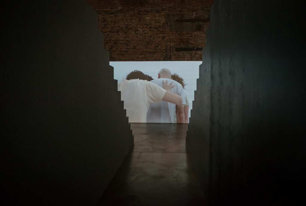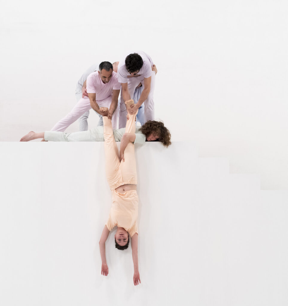 Los visitantes entran en la galería del museo por un corredor oscuro, cubierto con una tela negra, que alberga unas pinturas y varios objetos que bien podrían ser utilería para una obra teatral. En el piso, recostados contra las paredes de tela, hay cuatro pinturas en acuarela, unos palos de madera y una fotografía. A mitad de las paredes, se notan las sombras de la fotografía y las acuarelas como si se hubieran acabado de desmontar. Todos estos objetos parecen o haber quedado atrás o estar listos para usarse. Al final del corredor, los espectadores entran en un espacio con una escalera blanca masiva que lo divide por el medio diagonalmente. En esta área, un video presenta una versión de la escalera blanca con siete bailarines con telas en colores moviéndose alrededor de la misma al compás de un tambor y de otros sonidos de percusión en una expresión ritualista; a menudo como grupo, luchando entre sí, o a veces individualmente, interactuando con la estructura. En la galería, los visitantes solo tienen acceso al primer escalón, pero pueden interactuar con la estructura e imitar la escena representada en el video.