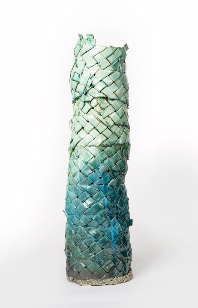 La artista de origen bahameño Anina Major (n. 1981, Nassau, Bahamas; vive en Nueva York) trabaja en la coyuntura de la cerámica, la escultura y la instalación, usando la arcilla para eternizar la práctica cultural del tejido, tradición cargada de historias de trabajo y ancestralidad. Al tejer a mano la arcilla semejando el trenzado de hojas de palma, Major aborda una tradición arraigada en nociones de suavidad e impermanencia para dotarla de permanencia y reverencia. Este trueque de la fibra orgánica a la tierra cocida honra la labor, los saberes y el linaje propios de la artesanía bahameña, elementos que a menudo se ignoran o se mercantilizan dentro de la economía turística. La práctica de Major refleja la tensión entre la imagen de las Bahamas como paraíso comercializado y las tradiciones culturales infravaloradas que definen su identidad.