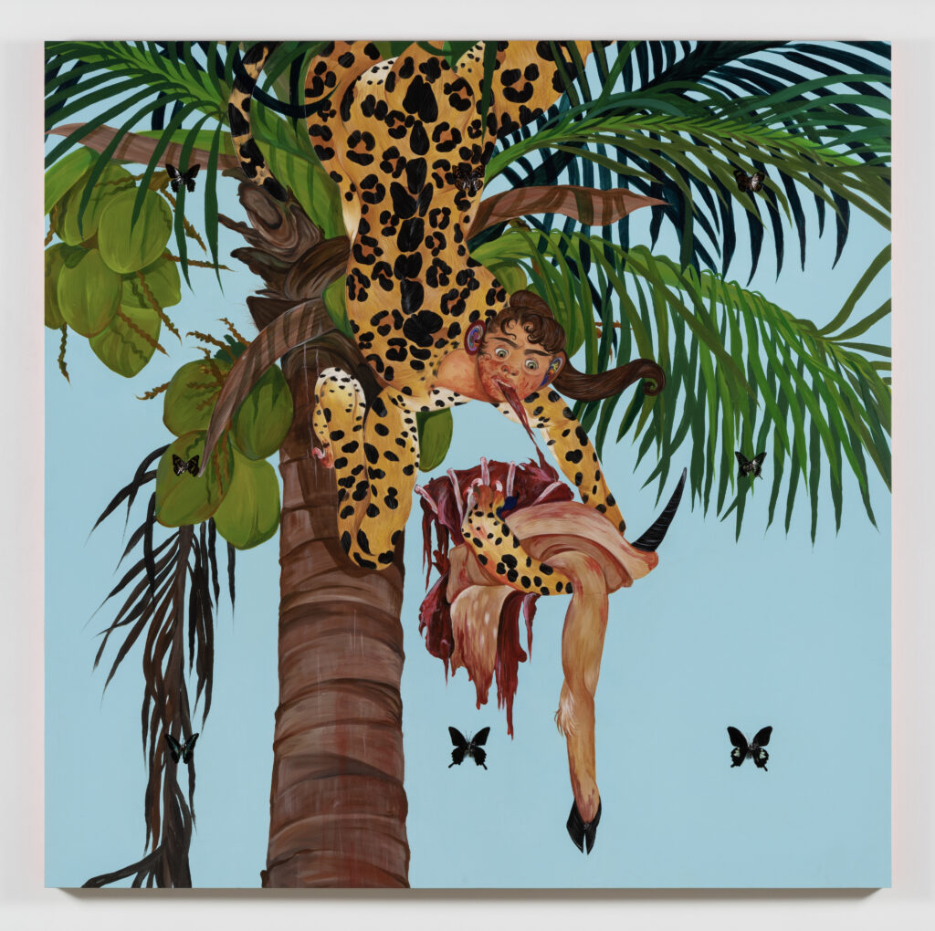 Sobre la superficie del lienzo hay ocho mariposas negras disecadas en forma de cuadricula. En la parte superior hay tres mariposas negras: dos encima de la copa de la palma, y una encima del cuerpo del jaguar. Al centro de la imagen hay una mariposa a cada lado de la pata descuartizada del animal, mientras en la parte inferior del lienzo tres mariposas flotan debajo de los racimos de cocos.